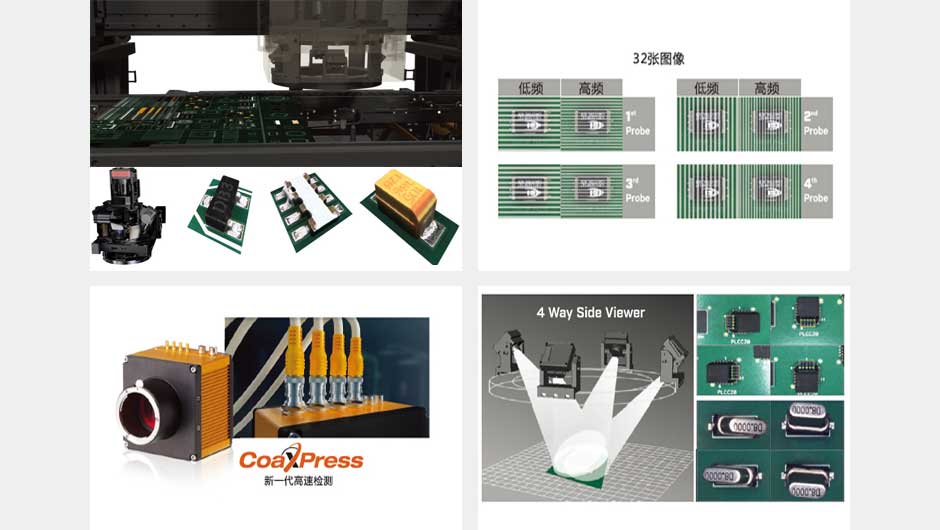 數(shù)字變頻投影技術(shù)利用4個(gè)3D發(fā)射頭獲取無盲點(diǎn)的3D圖像,結(jié)合高低頻摩爾條紋進(jìn)行組件高度檢測,應(yīng)用完整3D結(jié)合主相機(jī)進(jìn)行精確的檢測。